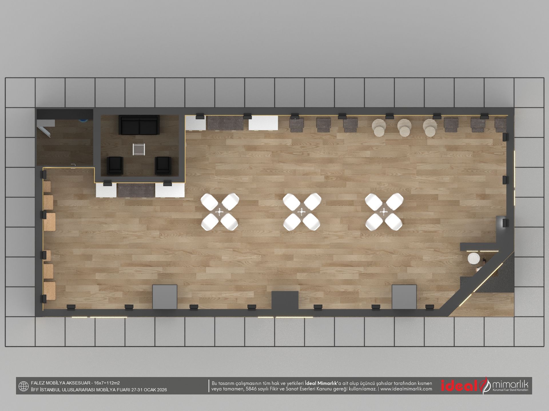 Fonksiyonel & etkili alan kullanımı: Ayakta durma, tanıtım, ürün sergileme ya da görüşme alanları gibi tüm ihtiyaçlarınıza göre alan planlaması yapılır ziyaretçilerin standınıza rahatça yaklaşması, etkileşime girmesi hedeflenir.